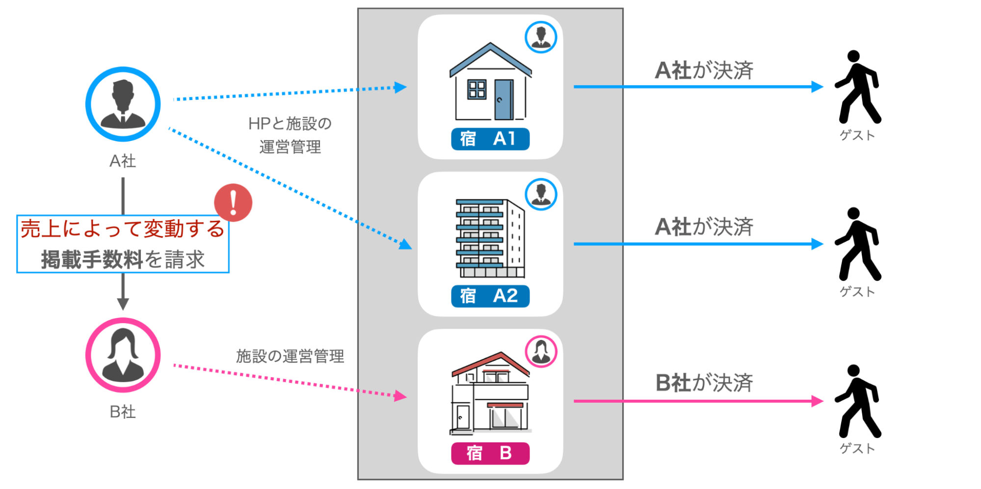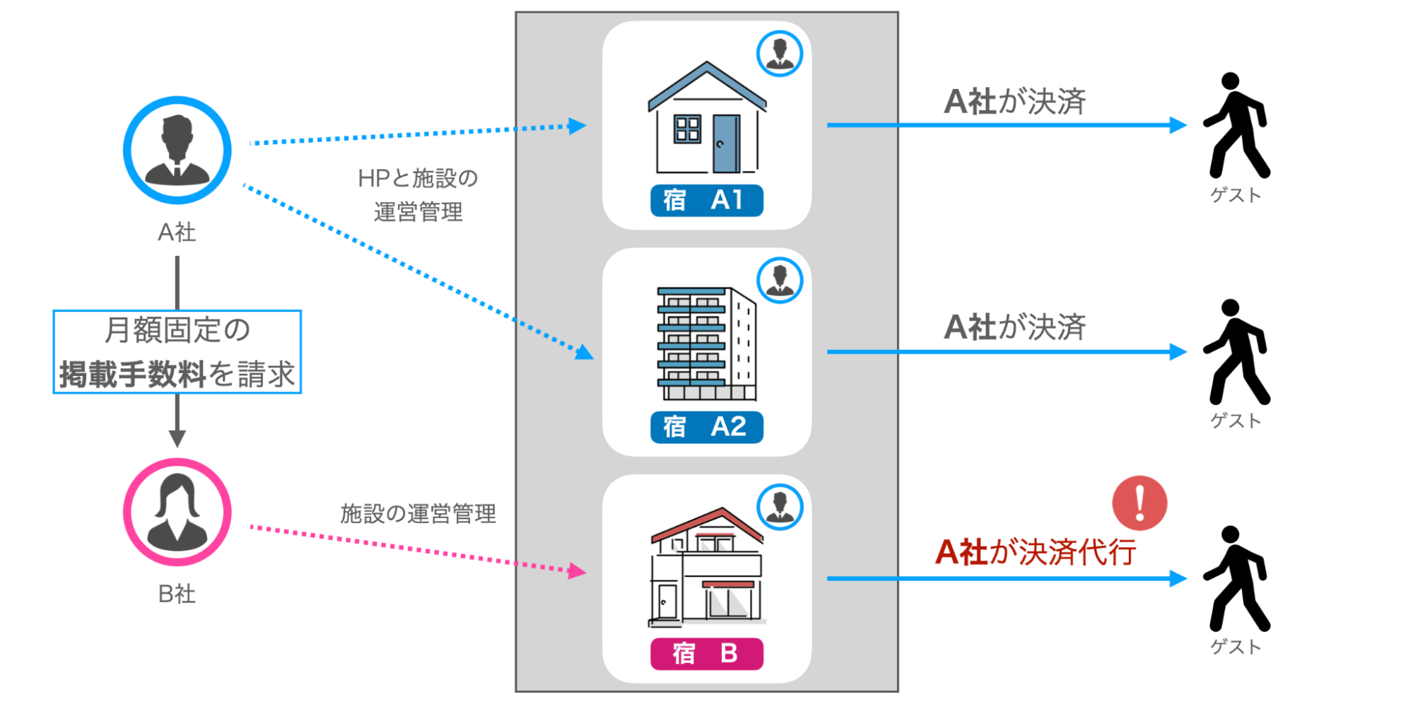 画像で示すように、A社が宿Bのゲストに対する決済を代行する契約です。