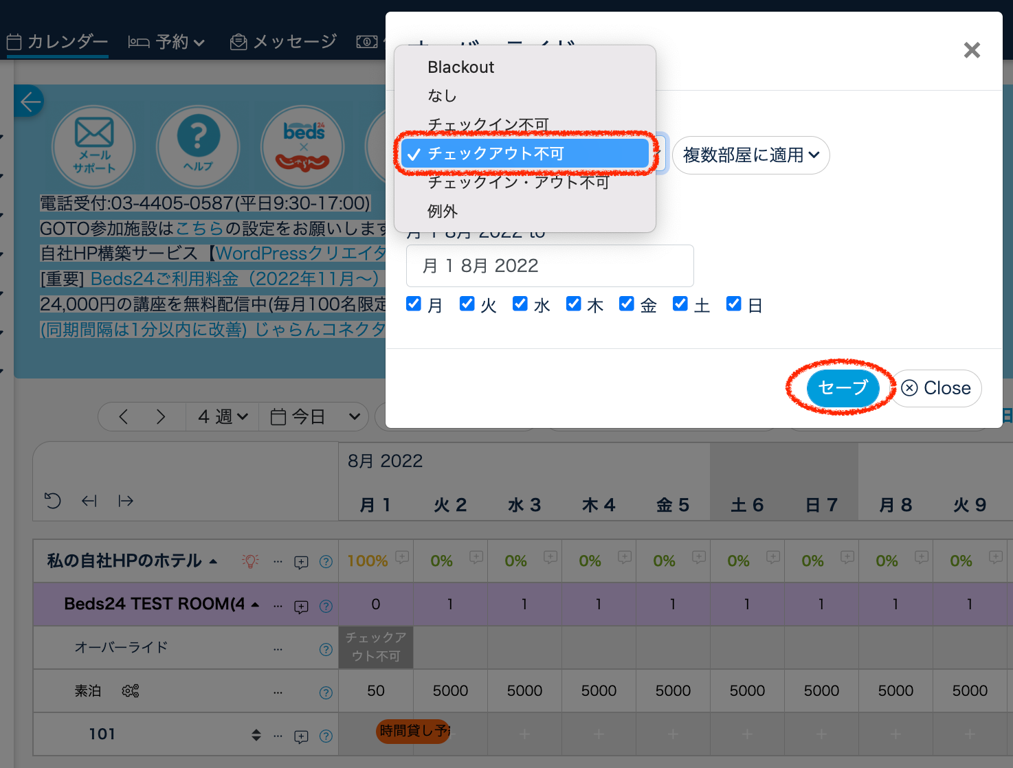 この設定で、該当日チェックアウトの宿泊予約だけをブロックできます。