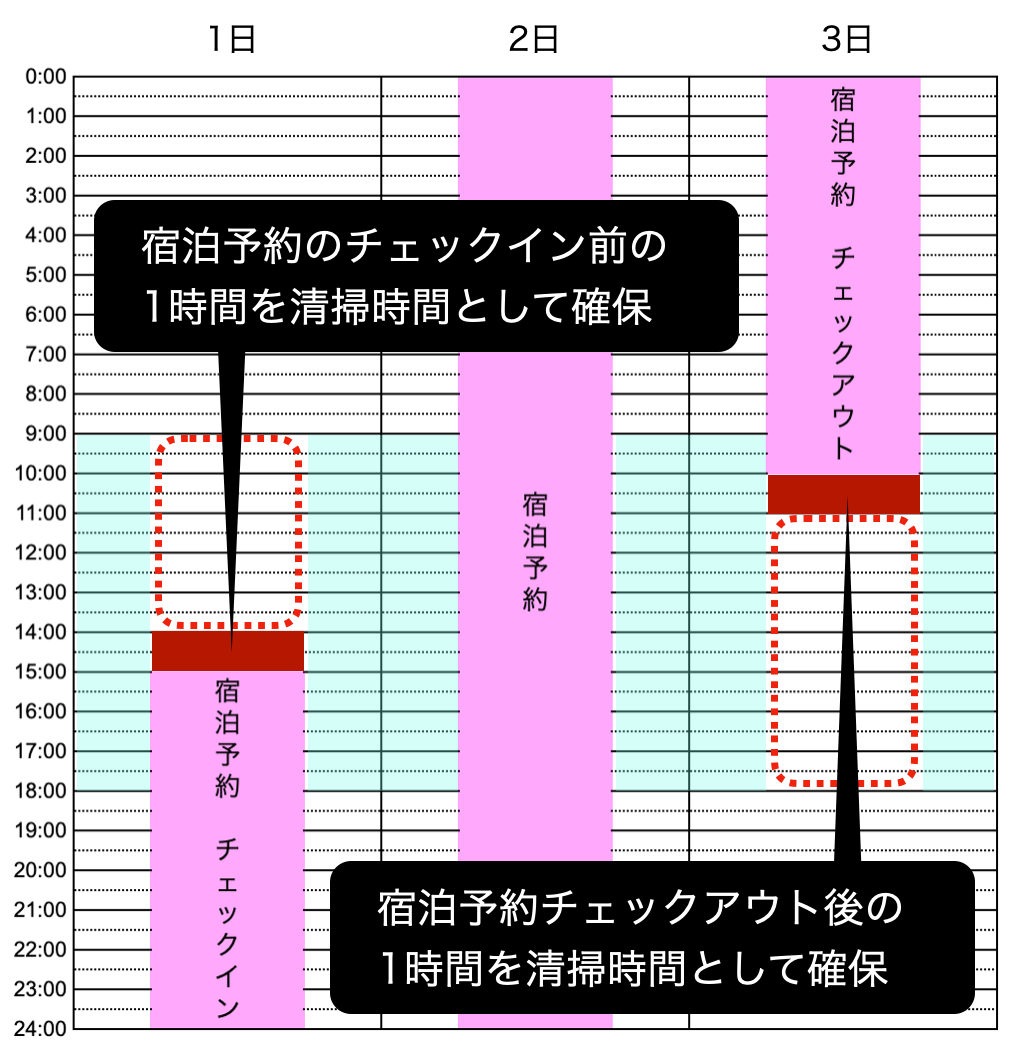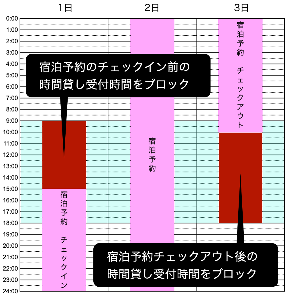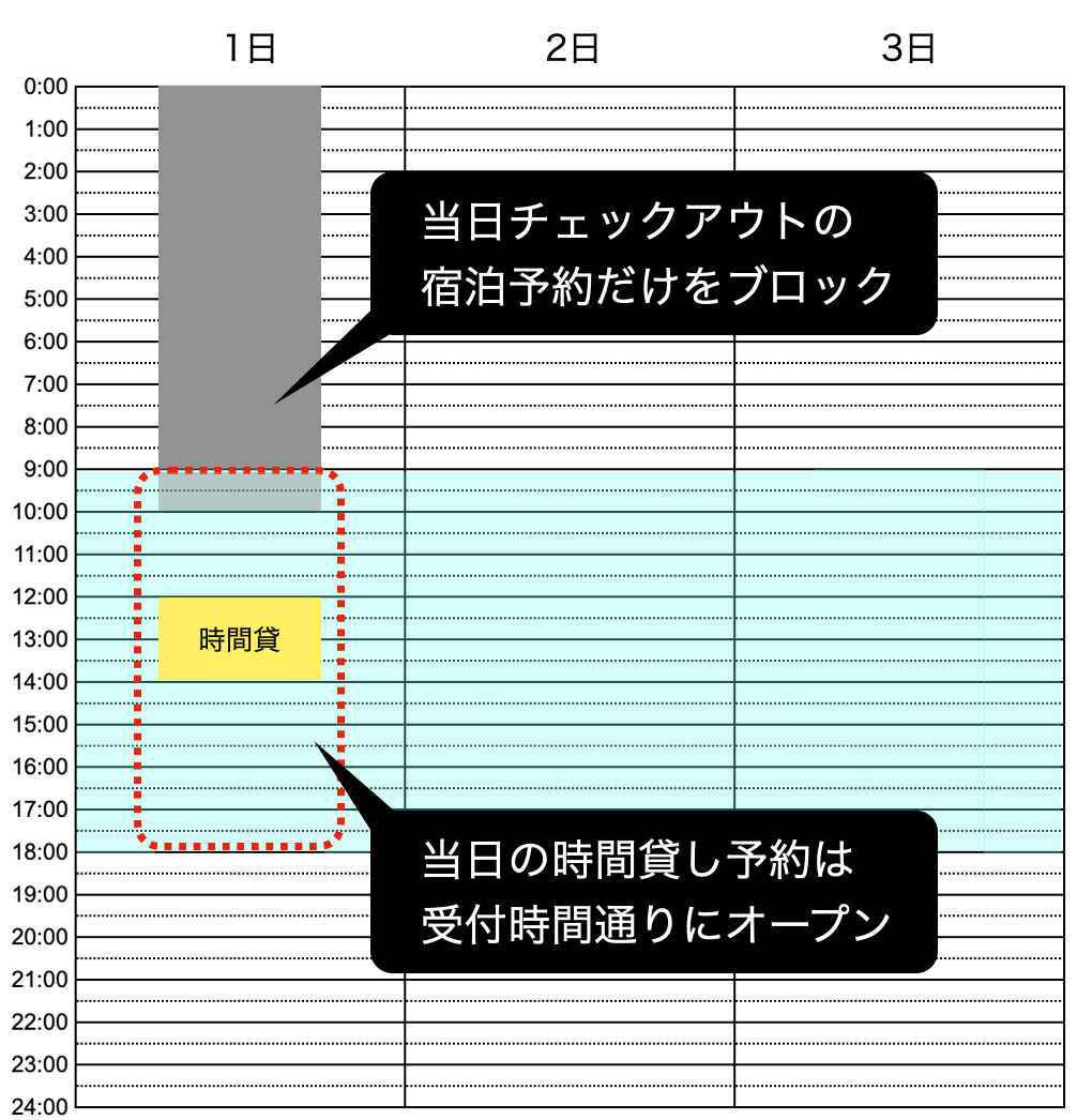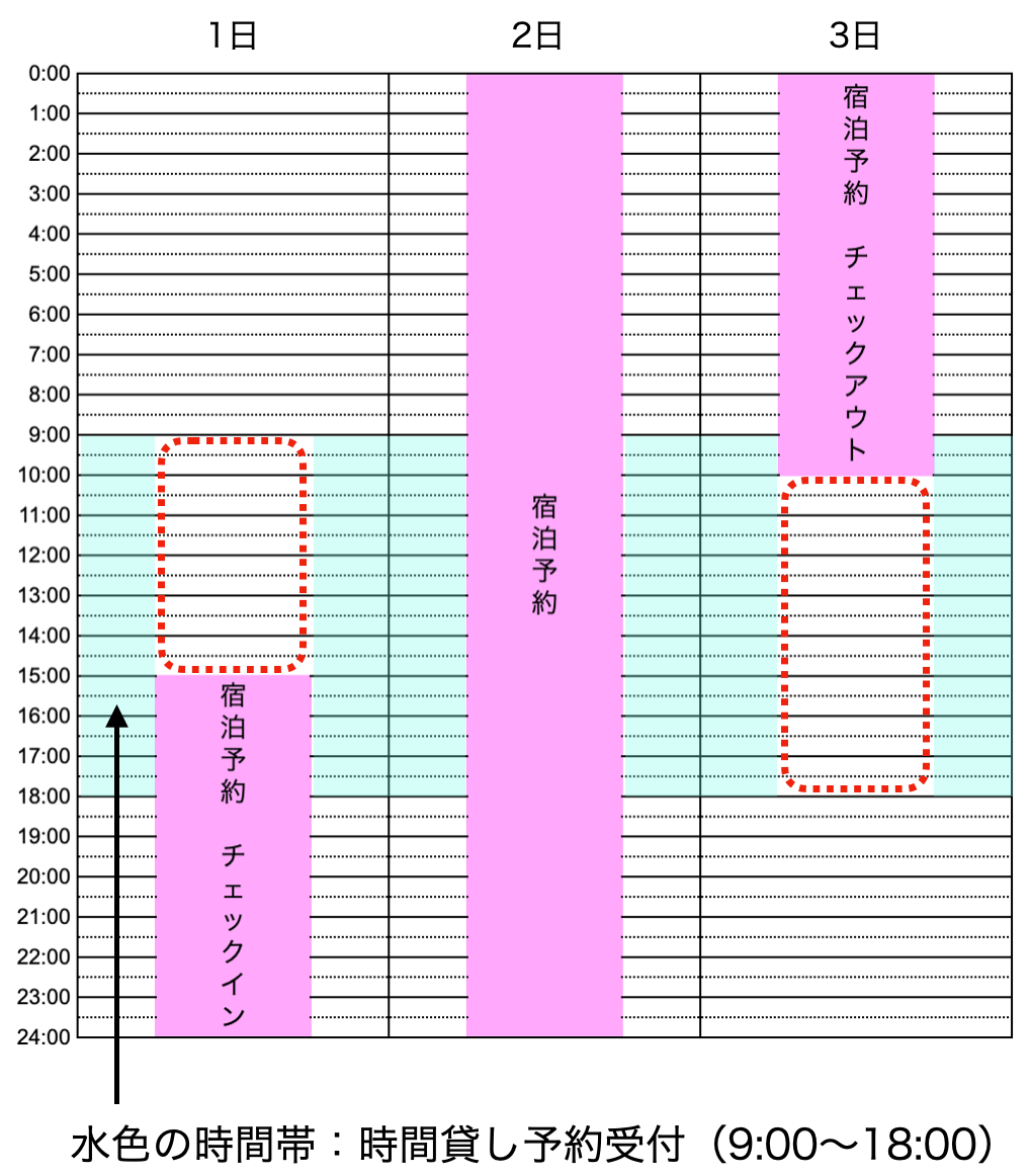 宿泊予約の前後の赤枠に、時間貸し予約が入る可能性があります。