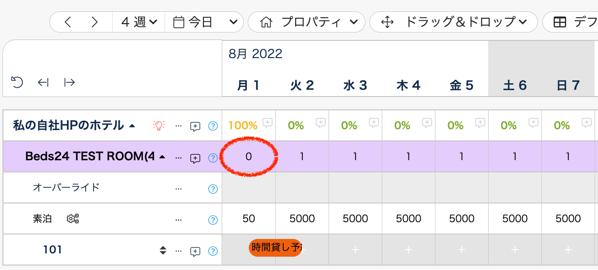 先に時間貸し予約が入ると、Beds24の在庫はゼロになります。