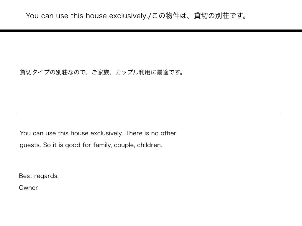 4.貸切で、共有スペースが無い民泊であることを伝える。