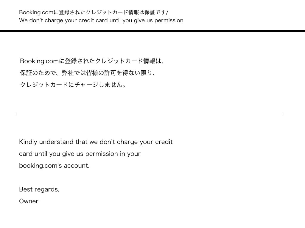 5. Booking.comでは、ゲストは予約時にクレジットカード情報を要求されるが、自動的にクレジットカードに料金がチャージされるわけではないことを伝える。