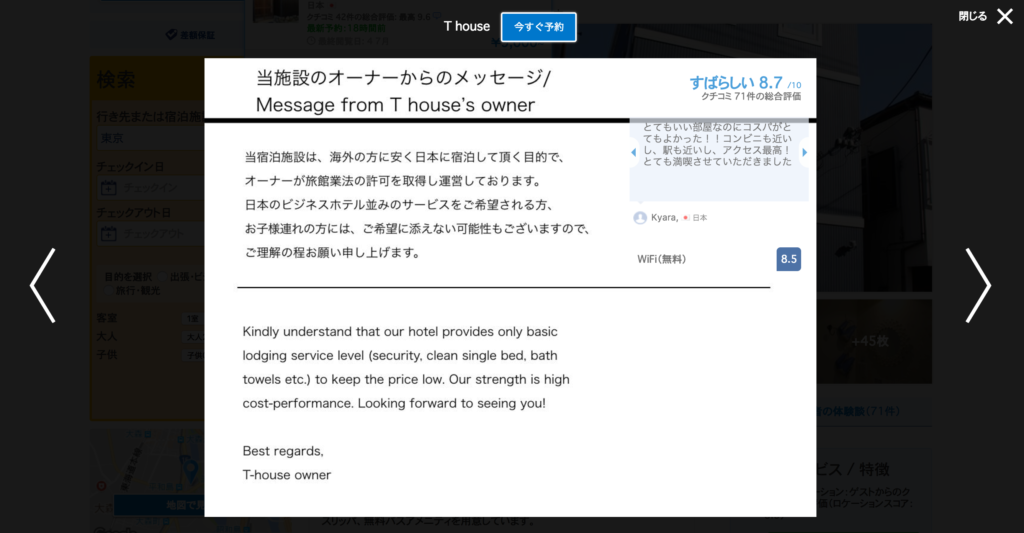 また、Booking.comは上記の画像のように、右上に口コミが表示される機能があります。故に、このようなメッセージを作る場合、左にメッセージを寄せて、右側は余白の作成をお勧めします。百聞は一見にしかずなので、こちらからTハウス東京のBooking.comのウェブサイトをご覧ください。