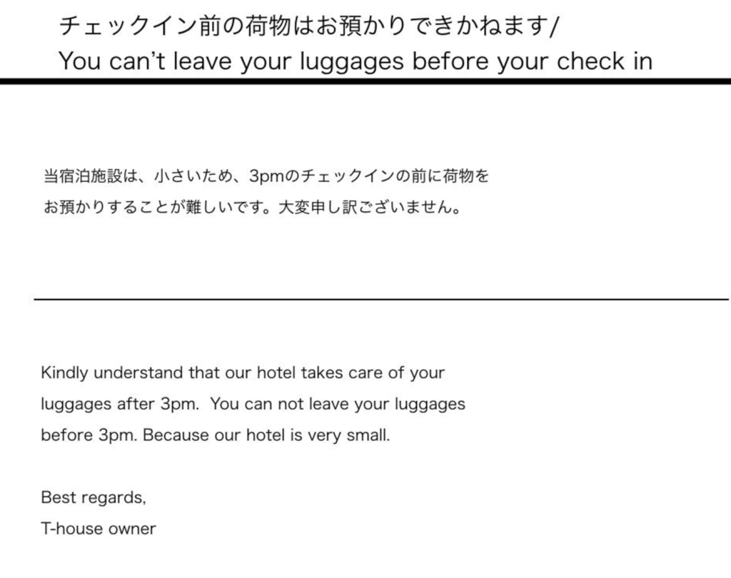 このように書いておかないと、「早く到着するから、荷物預かってほしい」とゲストから連絡が来ます。現場の管理者は掃除や他の仕事もあるので、このようにできないことはできないと、しっかり伝えましょう。