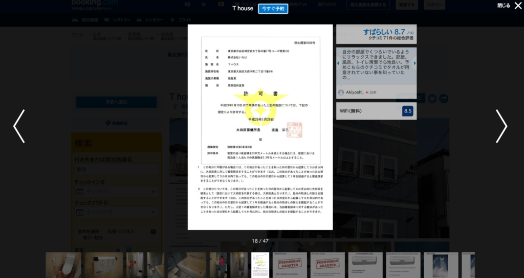例えば周りの家から、「あそこはいかがわしい違法民泊をしてるのか?」と思われた際、この許可証をBooking.com、楽天トラベルなどに掲示しておけば、「ああ、ここは許可を得て、しっかりやってるのか」と納得して頂けます。