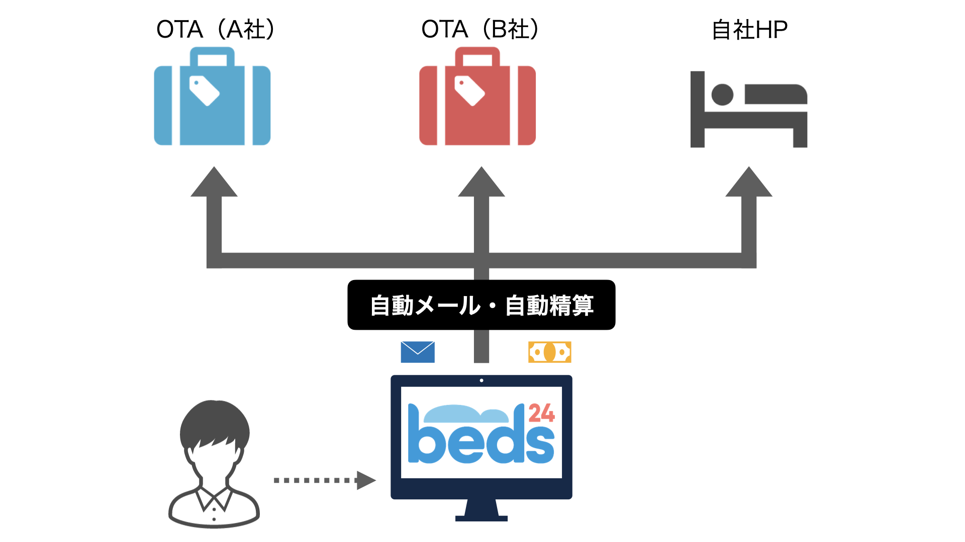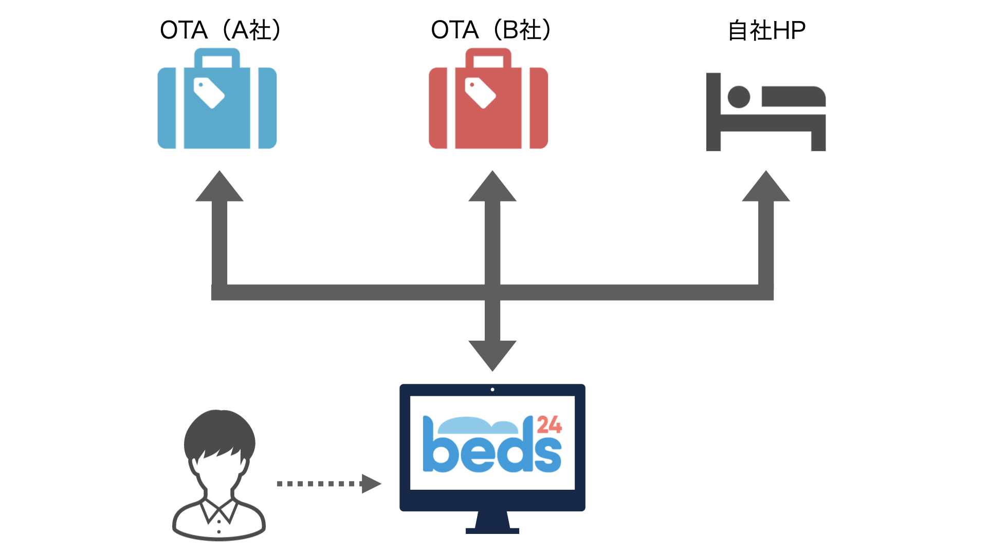 2つのOTA、自社HP、Beds24を利用すると仮定して解説します。
