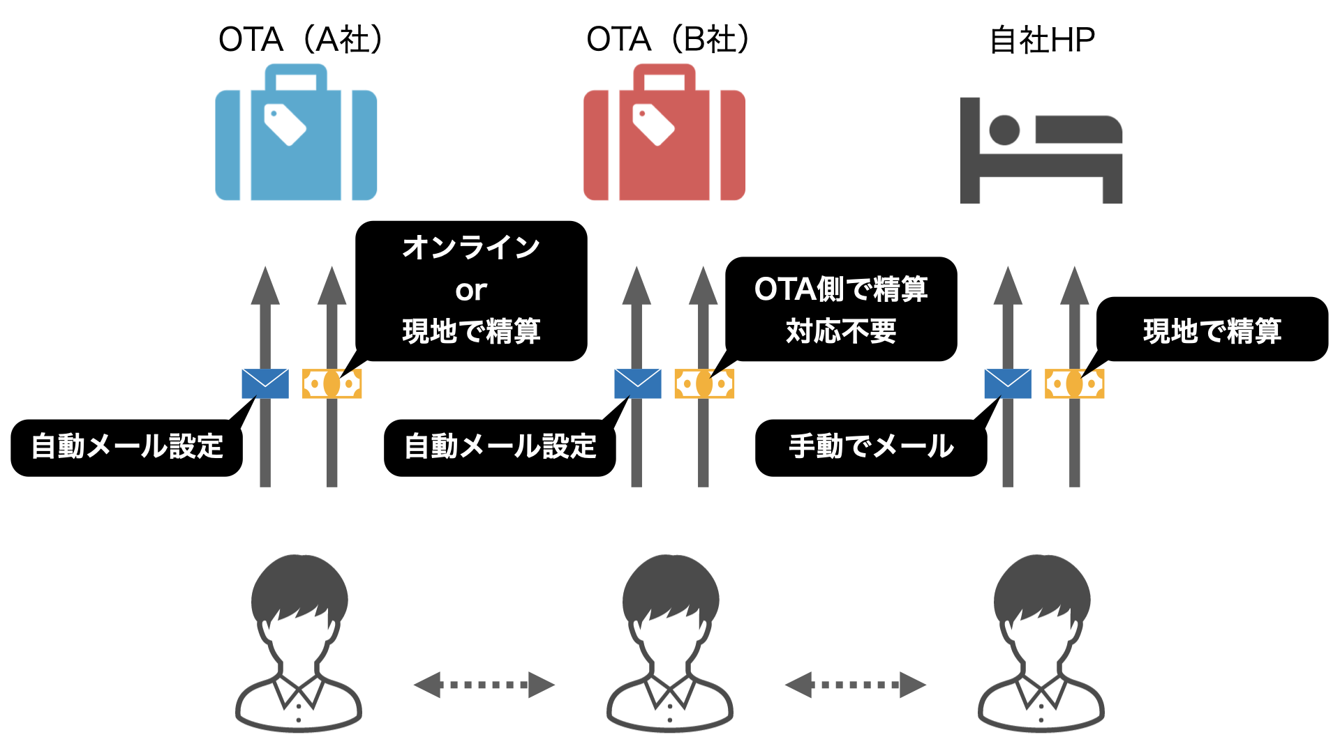 - OTA、自社HPそれぞれで異なる対応が必要