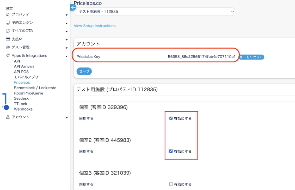 PriceLabsキー:Beds24の設定> Apps & Integrations>PriceLabsページのPriceLabsキーを入力します。