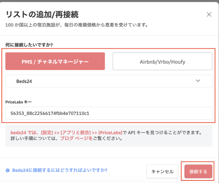 ・Beds24とPriceLabsとの連動は、お客様ご自身で行っていただく必要がございます。