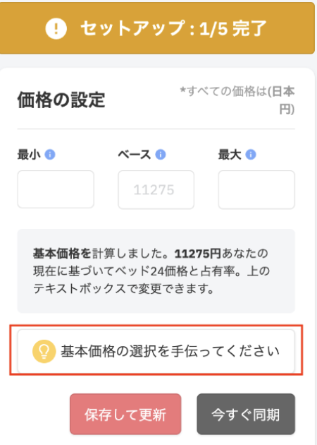 ※先にBeds24カレンダー画面でPriceLabs用の日別料金に1年間価格が入力されていないとエラーが発生します。