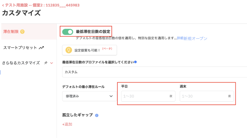6.カスタマイズの[編集]をクリックし、最低滞在日数の設定を行います。