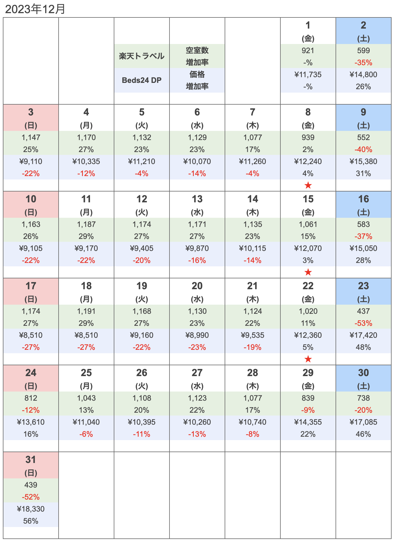これを客観的に確かめるため、楽天の空室カレンダーと比較をします。