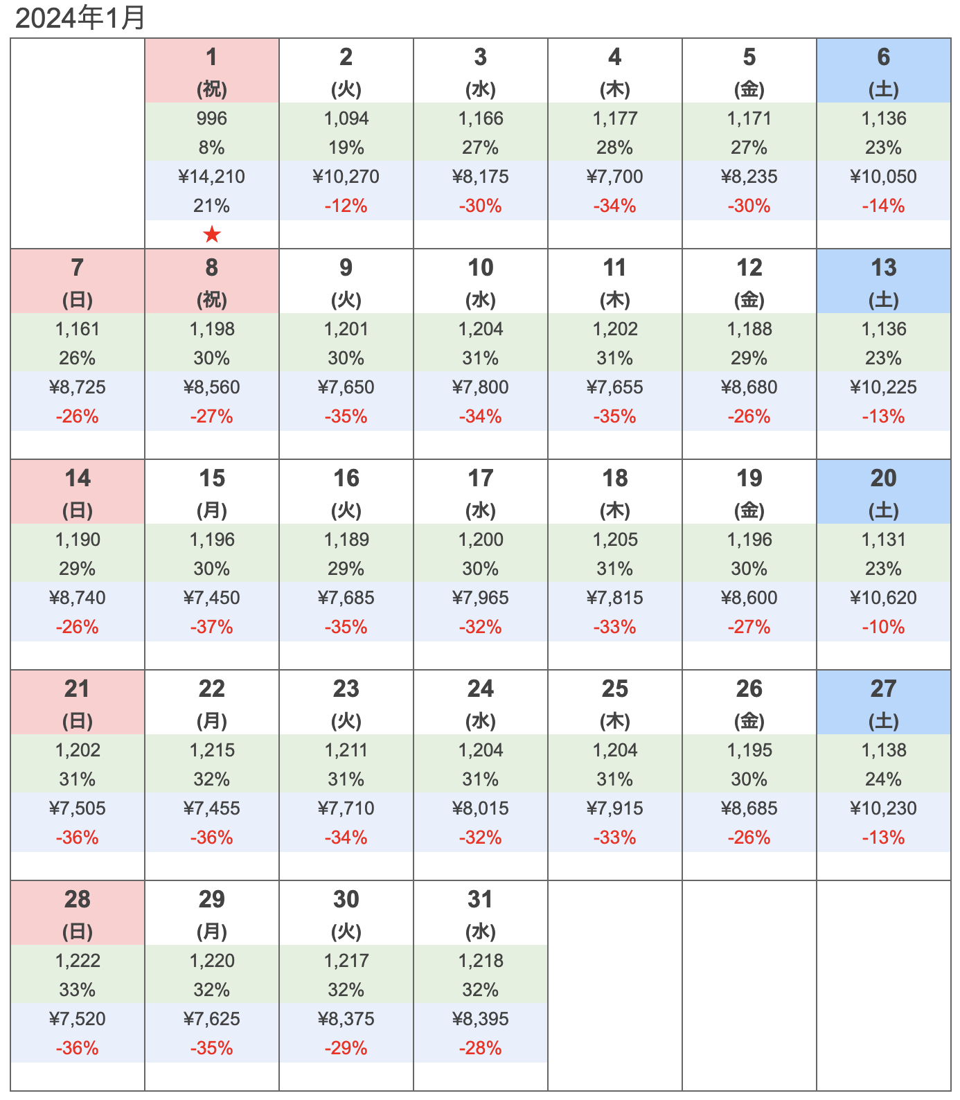 1月1日は元旦のため、Beds24のDPは高い価格を提示