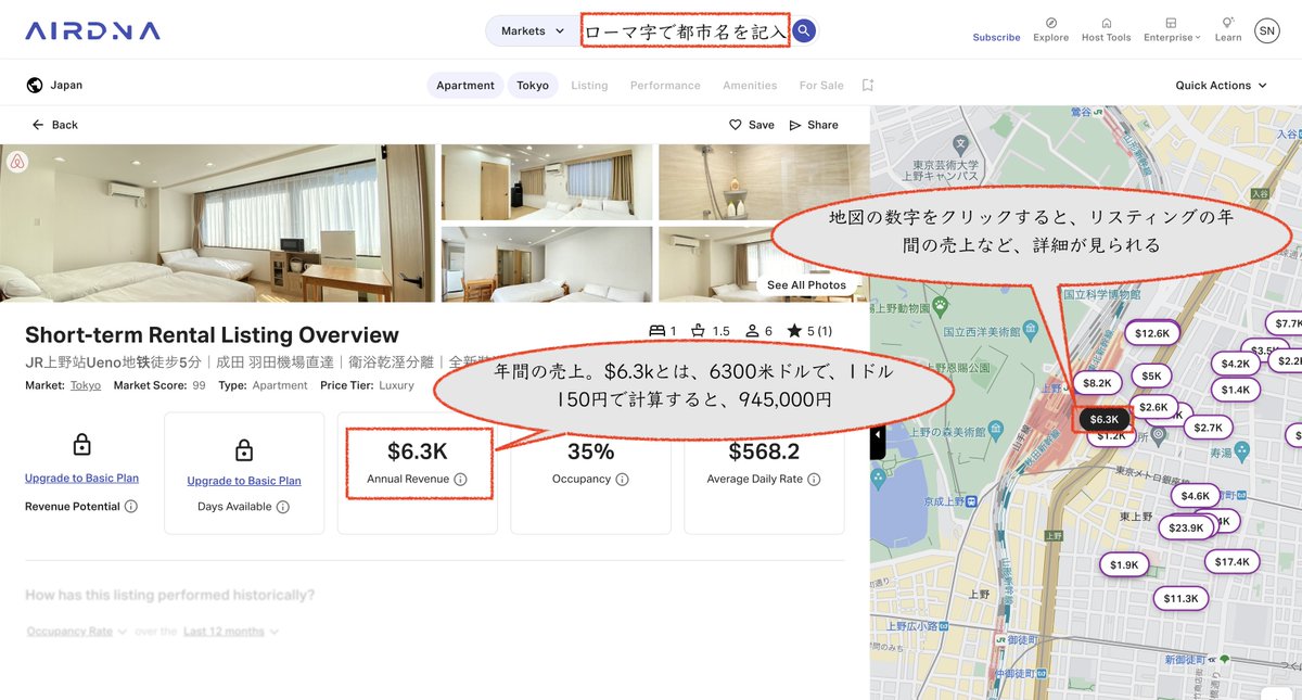 上記の画像では、上野駅前の物件の年間売上が945,000円($6.3k)と出ました。