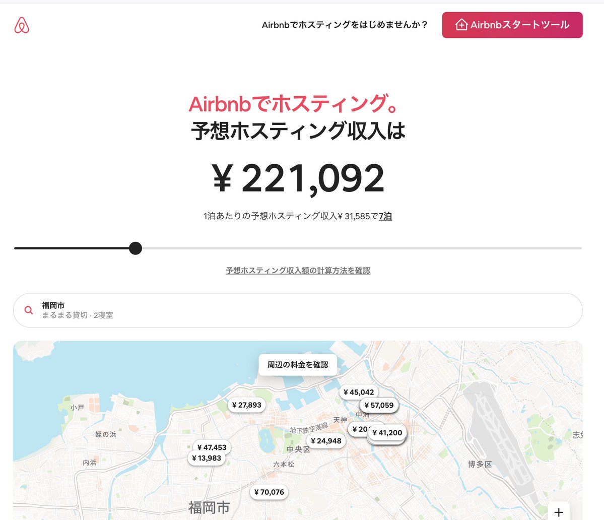 この計算は、あなたの想定競合といえるAirbnbの既存の民泊の実績値から、Airbnbが無料で計算してくれます。