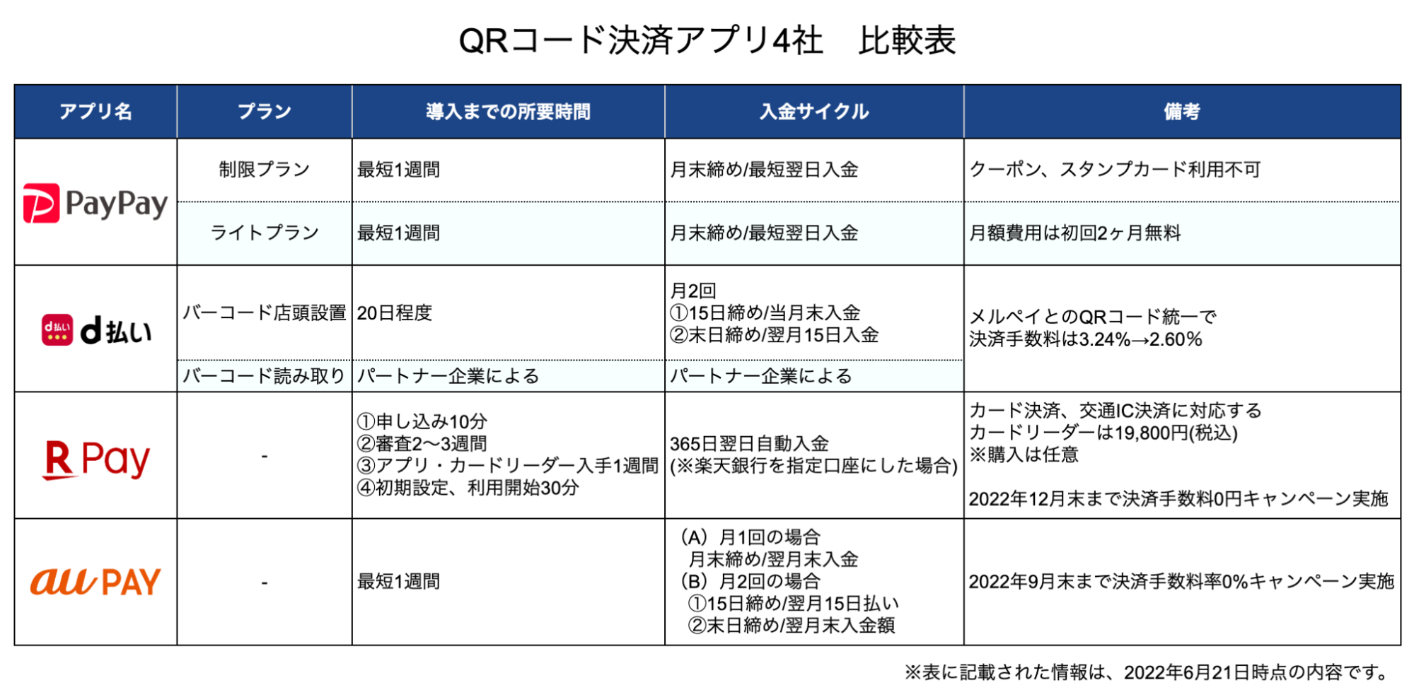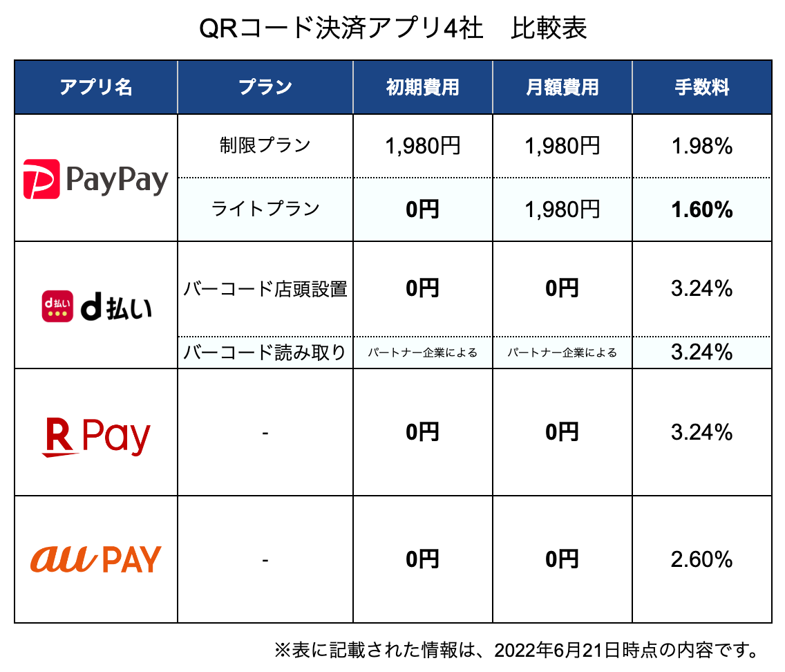 初期費用、月額費用がかからないのは、d払い、楽天ペイ、au PAYです。