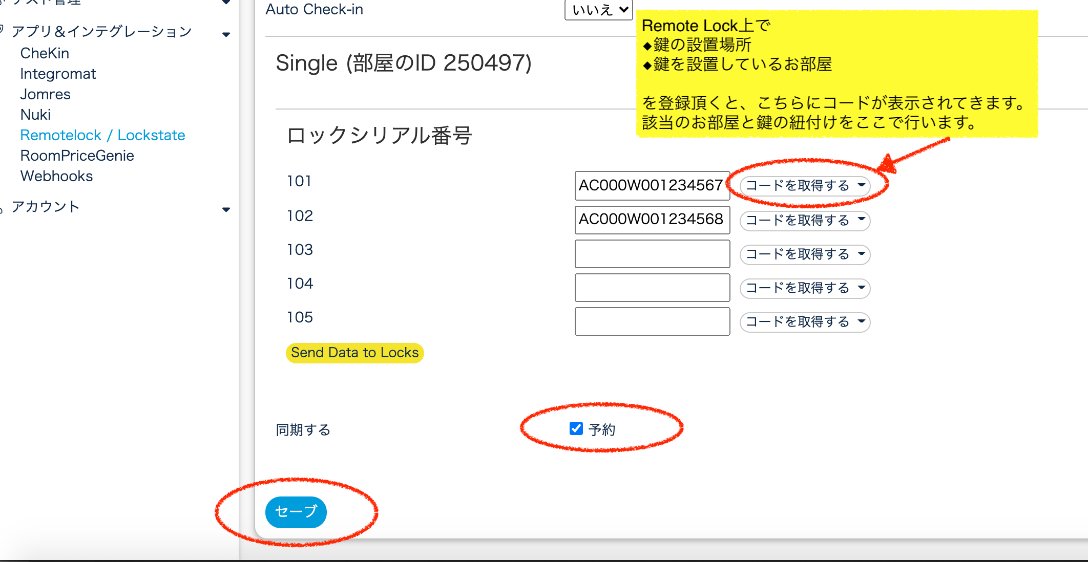 ・Remote Lockにある「共用ドア」との連動はできません。必ず予約が入るお部屋の鍵との連動を実施してください。
