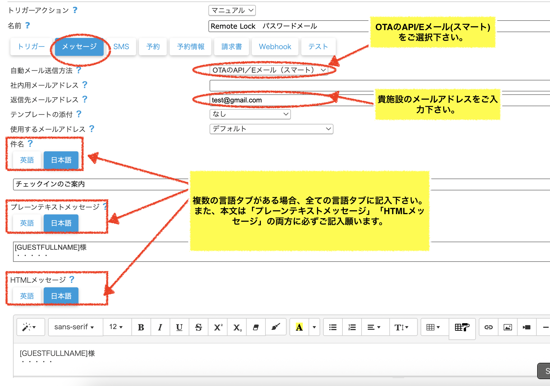 次に、「メッセージ」タブでメールの設定をします。