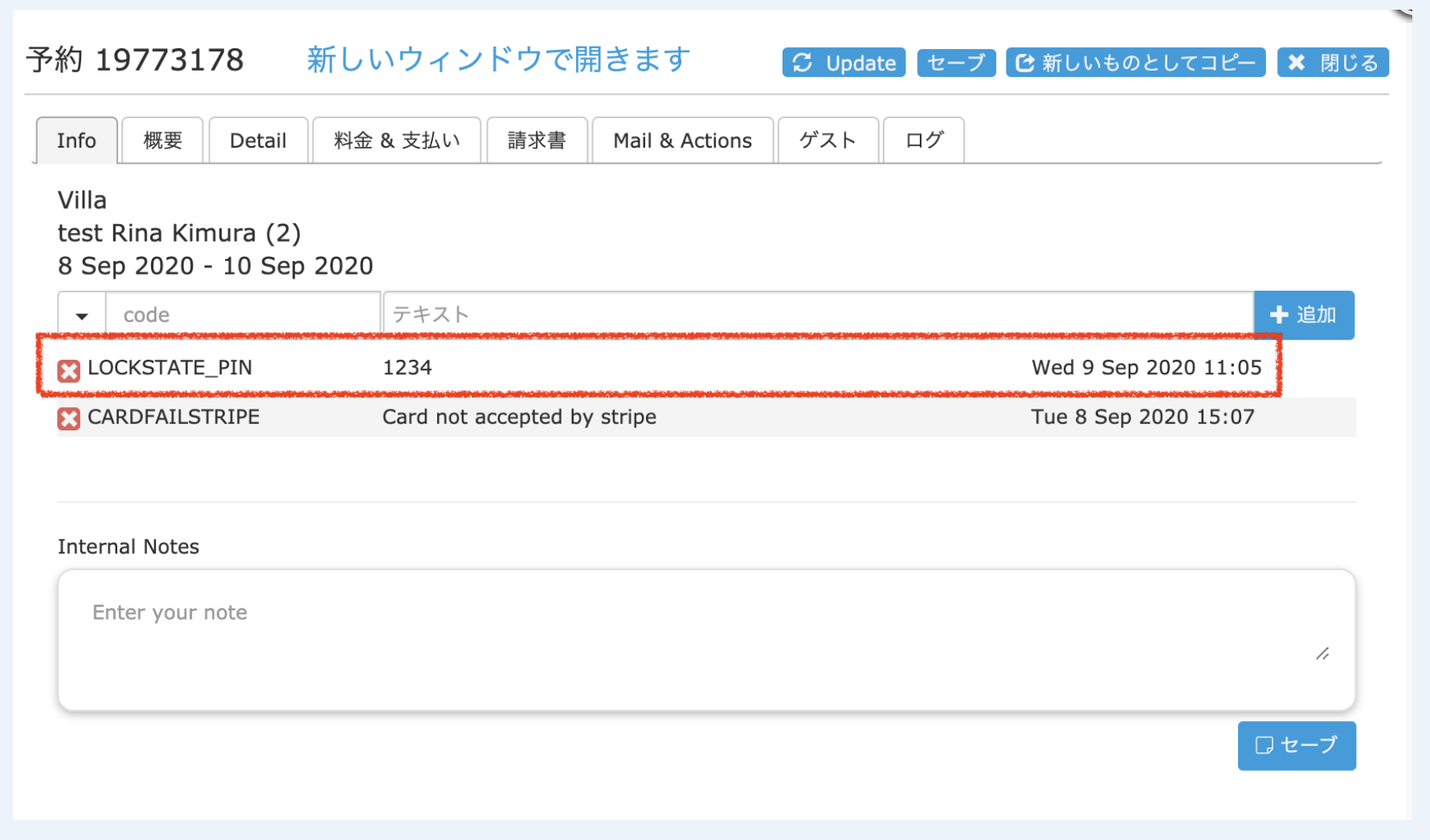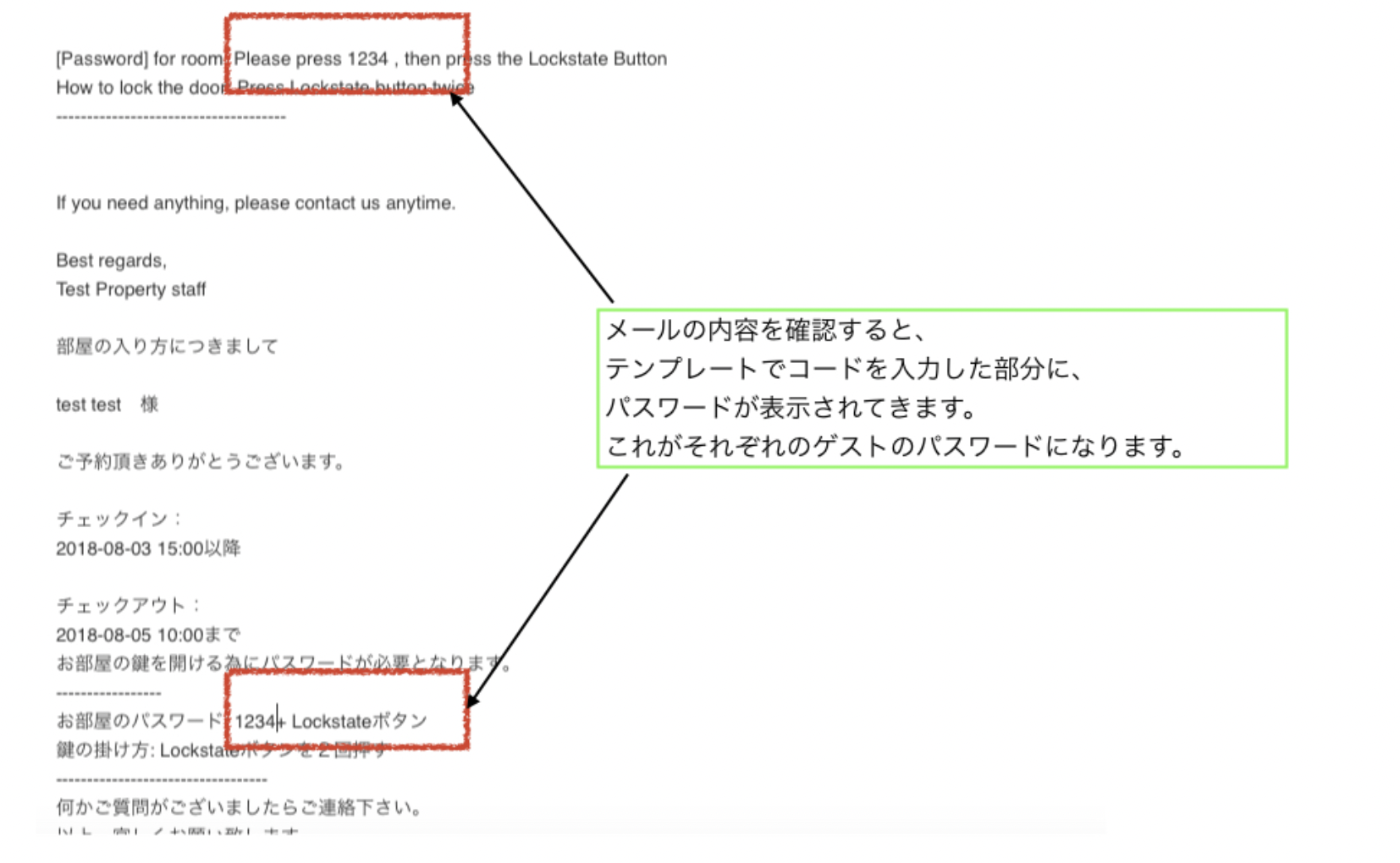 お部屋のパスワード: [BOOKINGINFOCODE:LOCKSTATE_PIN] + Lockstateボタン