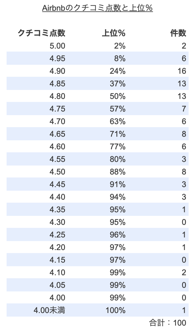あなたの宿のクチコミが上位何%なのか、以下の表で確認してみましょう。