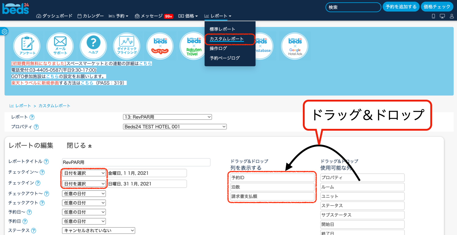 Beds24カスタムレポートを画像の通り設定し、セーブしてください。