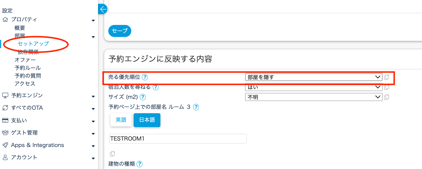 設定>プロパティ>部屋>セットアップ > 予約エンジンに反映する内容 から「売る優先順位」を「部屋を隠す」にします