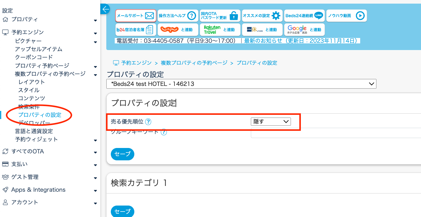 設定 > 予約エンジン > 複数プロパティの予約ページ > プロパティの設定 から「売る優先順位」を「隠す」にします
