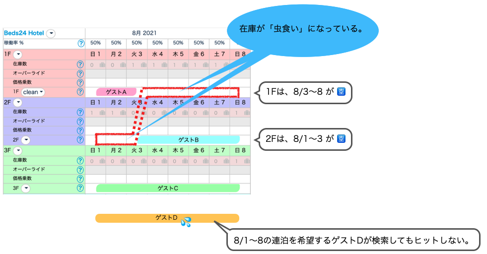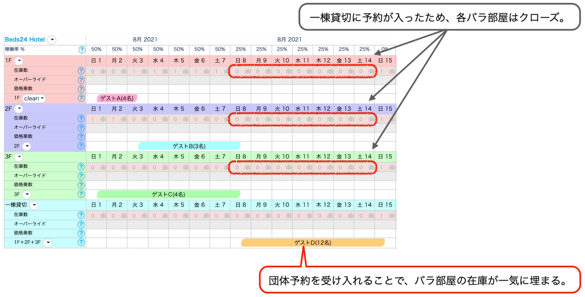 Beds24はバラ売りの在庫と、一棟貸切の在庫を自動で調整します。