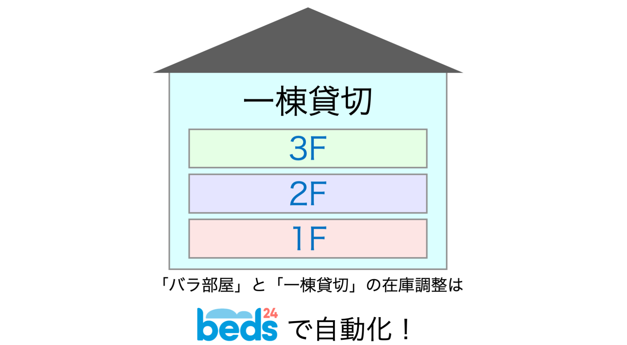 ・一棟貸切に予約が入ったら、バラ部屋(1F、2F、3F)の在庫を閉じる必要あり。