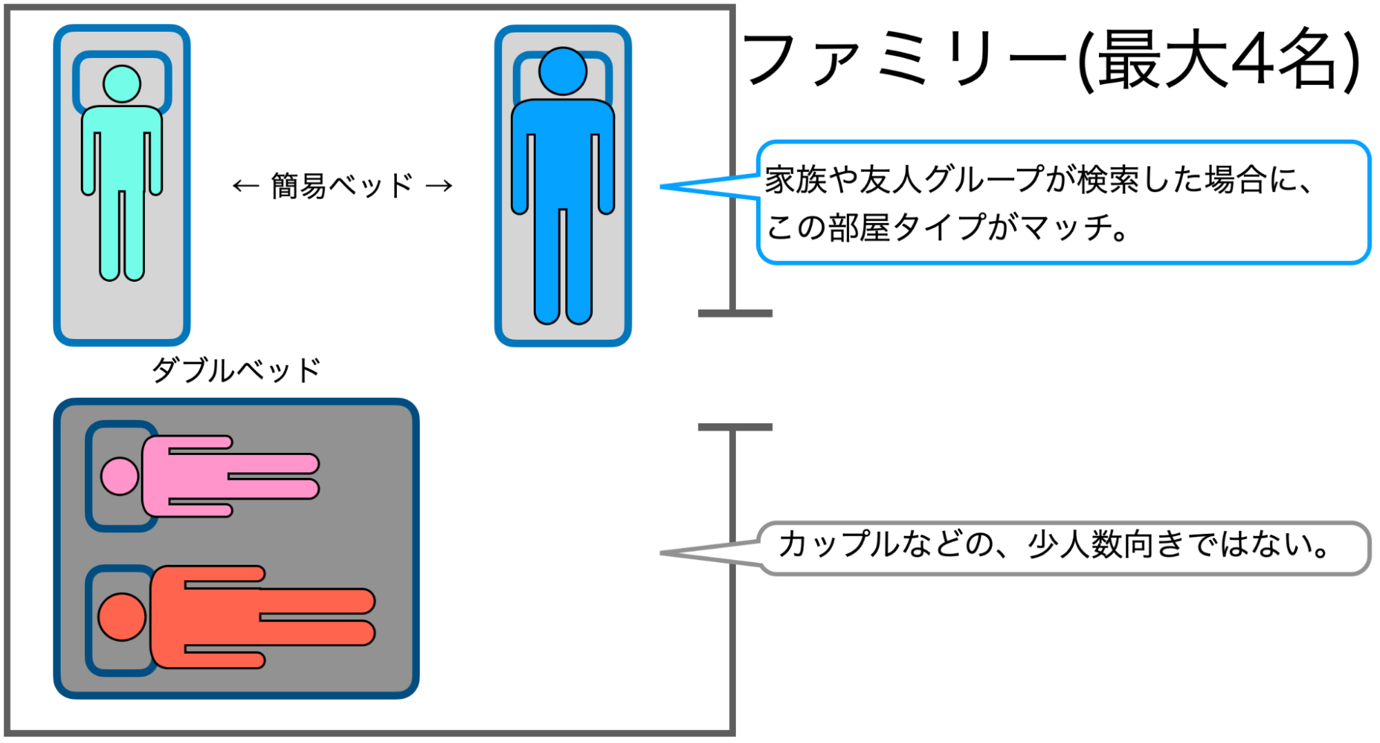 以下に、「ダブルルーム」と「ファミリールーム」を同時に集客する例を上げます。