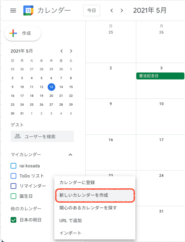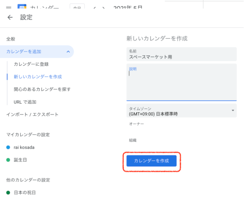 4.「スペースマーケット用」などのわかりやすい名前を入力し、「カレンダーを作成」ボタンを押します。