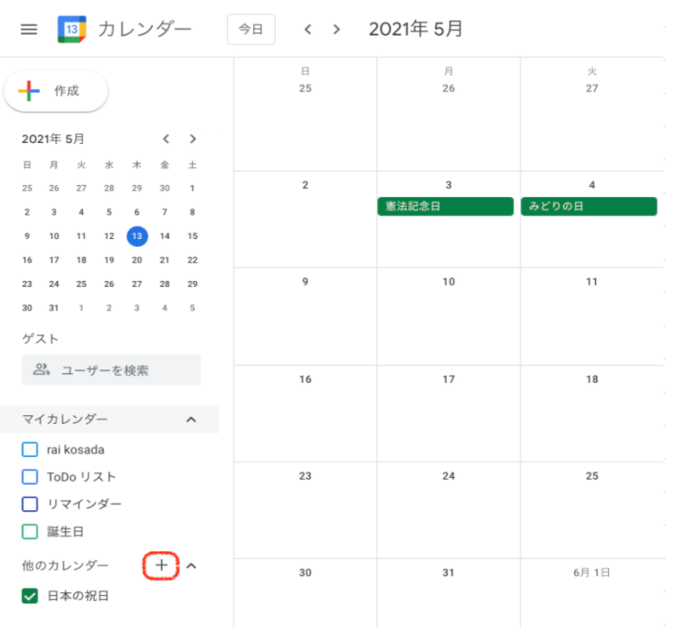 2.画面左下の「他のカレンダー」右横の「+」ボタンを押します。