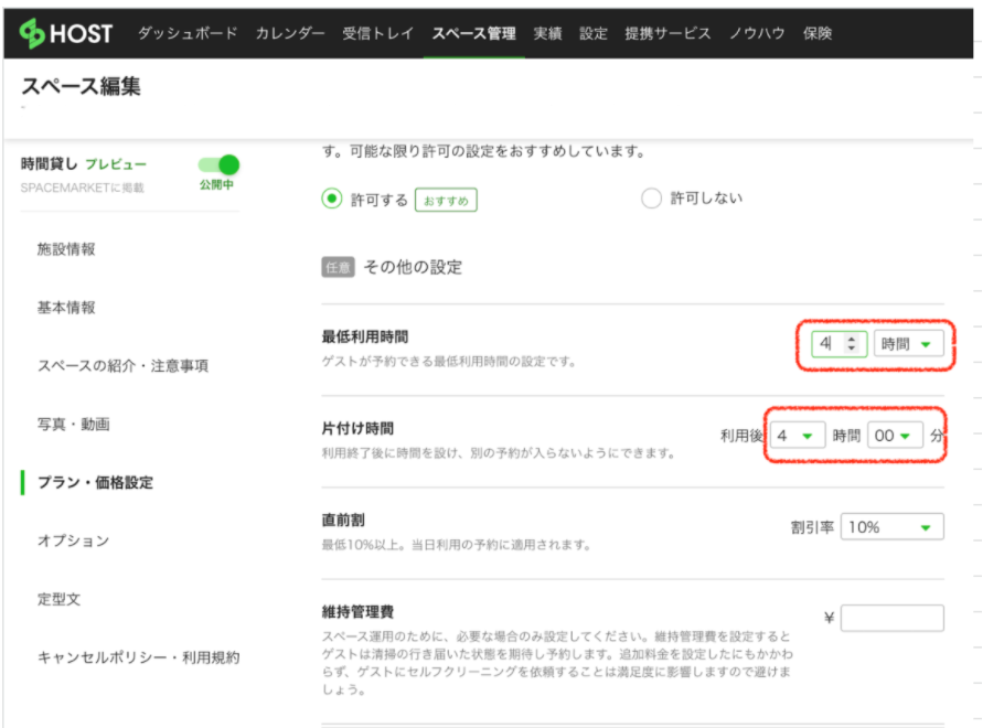 ■スペースマーケット管理画面で、最低利用時間・片付け時間を設定