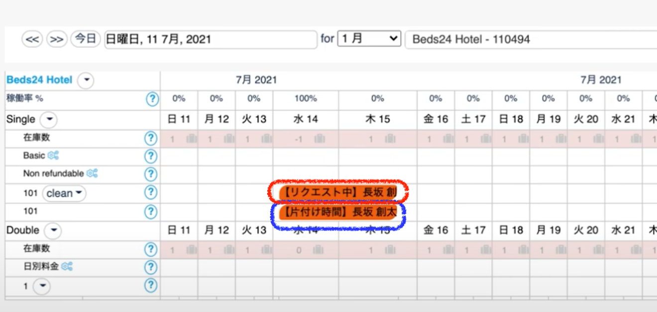 通常、スペースマーケットから予約が入ると、【実際の予約】と【片付け時間】の2つの予約がBeds24に取り込まれます。