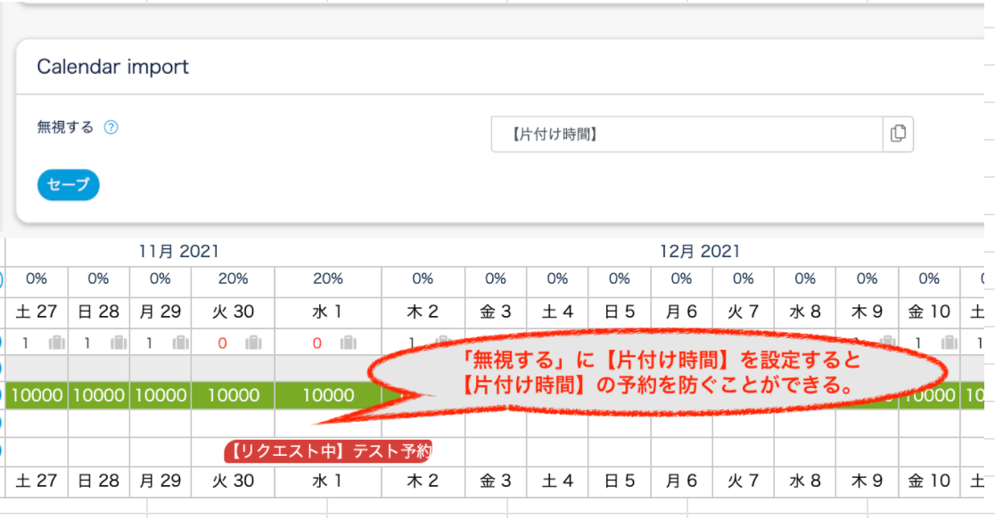 設定 > すべてのOTA > Googleカレンダー > 特定のコンテンツ > Calendar importの「無視する」 に【片付け時間】と入力します。
