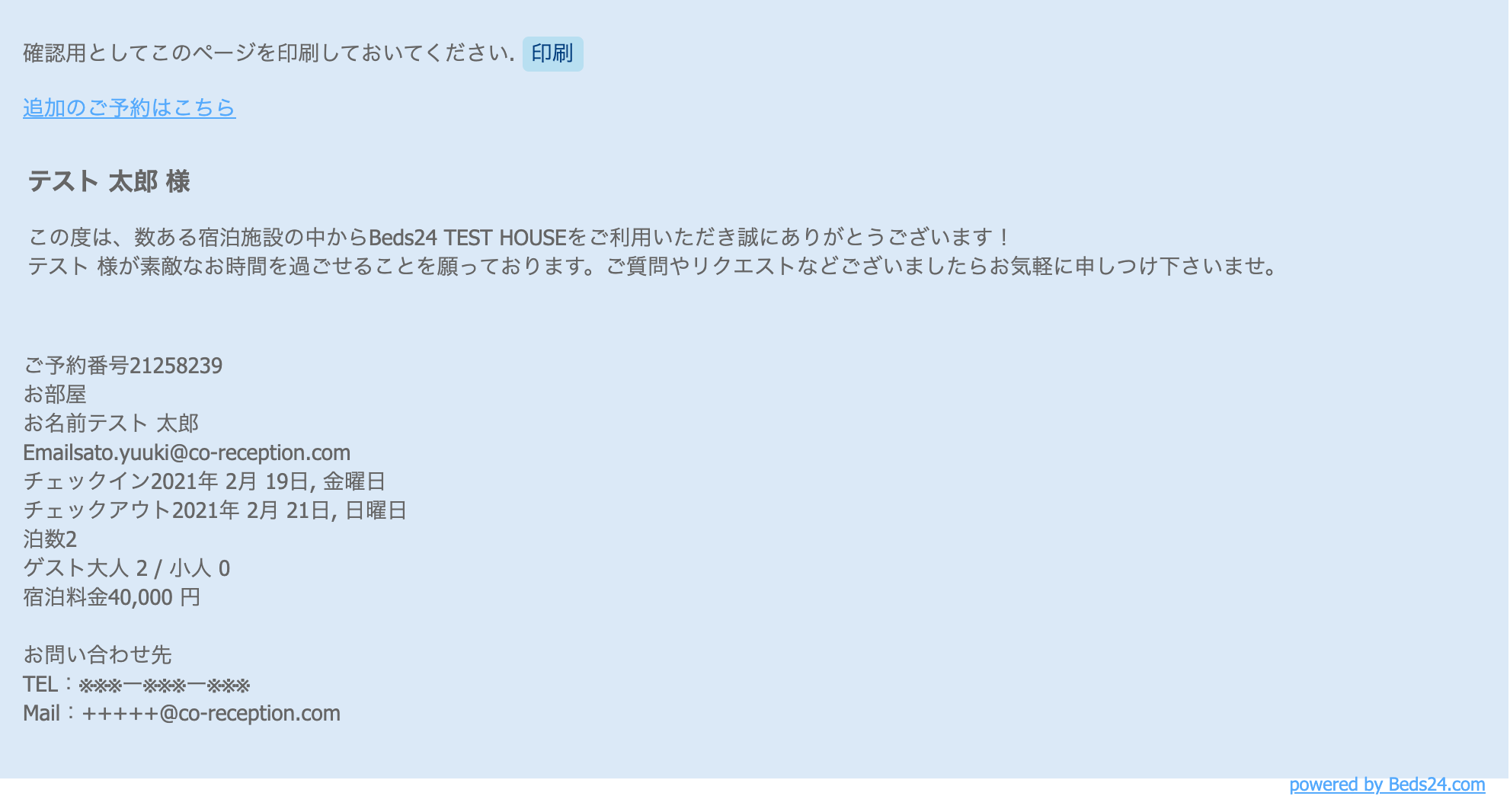 ただし、ゲストが不安に思うことを防ぐため、オリジナルページに「予約が確定致しました。予約の詳細は予約時に入力されたメールアドレス宛に送信しておりますので、ご確認ください。」などの注意書きを表示させるなど、工夫が必要です。
