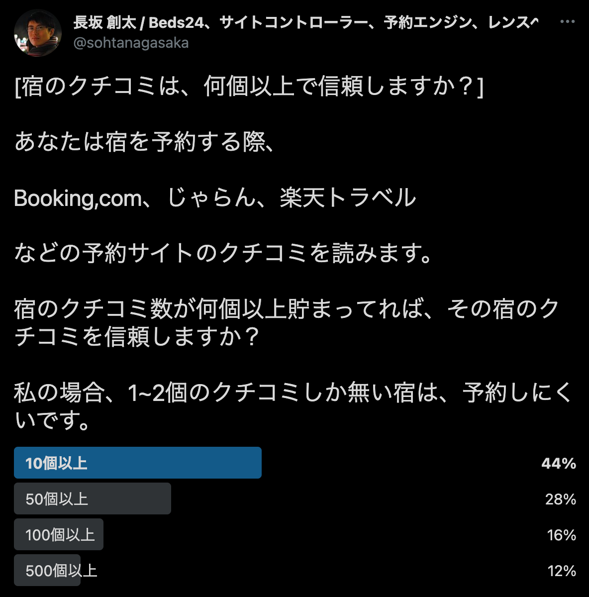 クチコミが50件に満たない宿の信頼度は、低い可能性が高いです。
