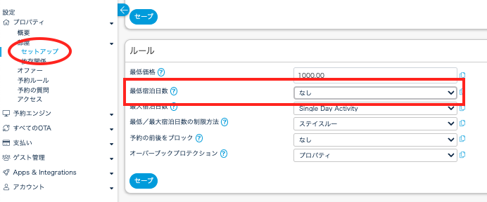1.設定 > プロパティ > 部屋 > セットアップ > ルールで最低宿泊日数を「2」に設定