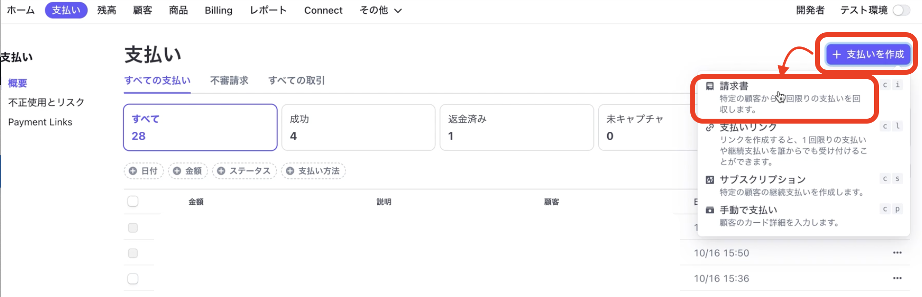 ①ストライプにログイン後、支払い→支払いを作成ボタン→請求書をクリック