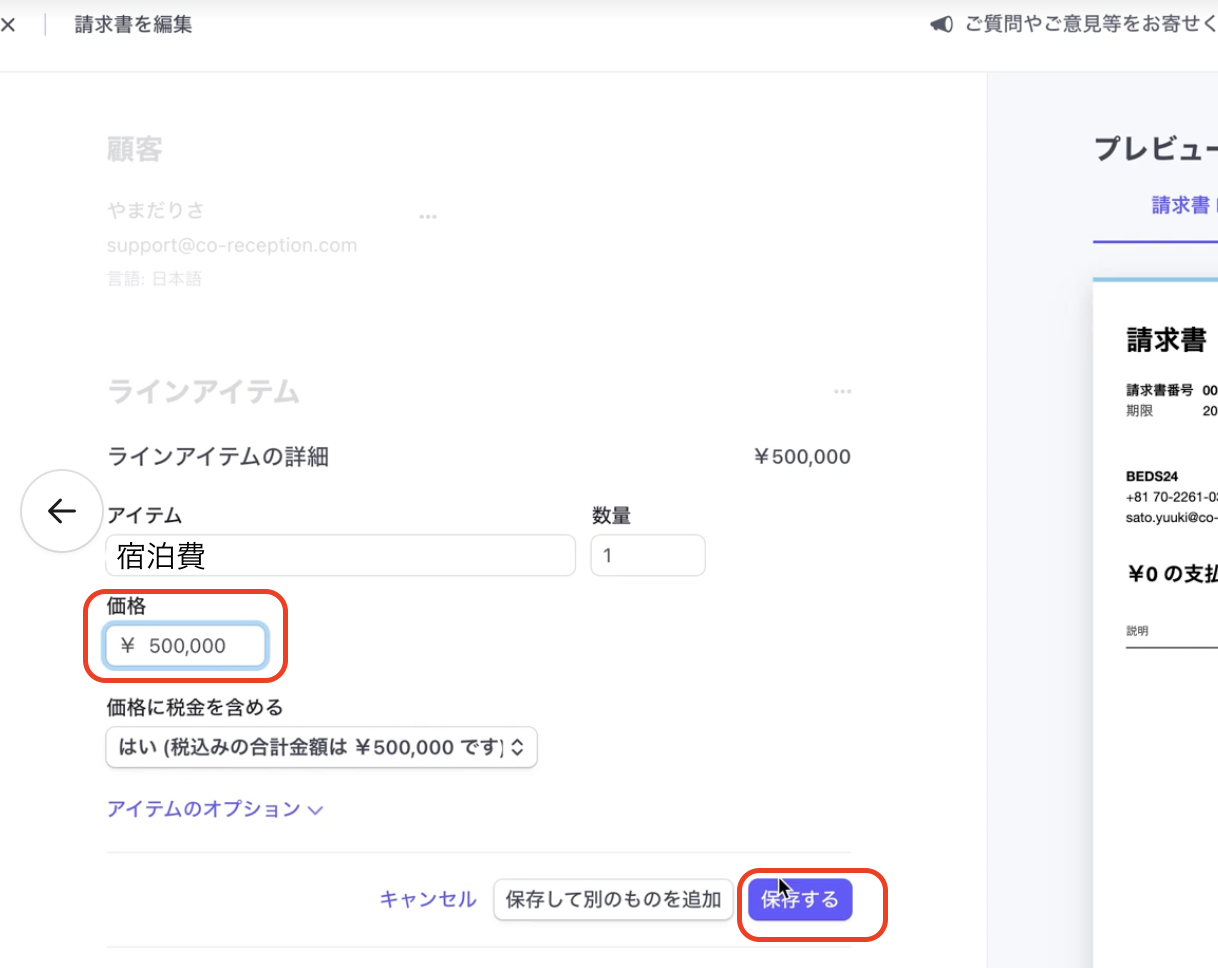 ③ラインアイテムに”宿泊費”など請求内容を記載し、