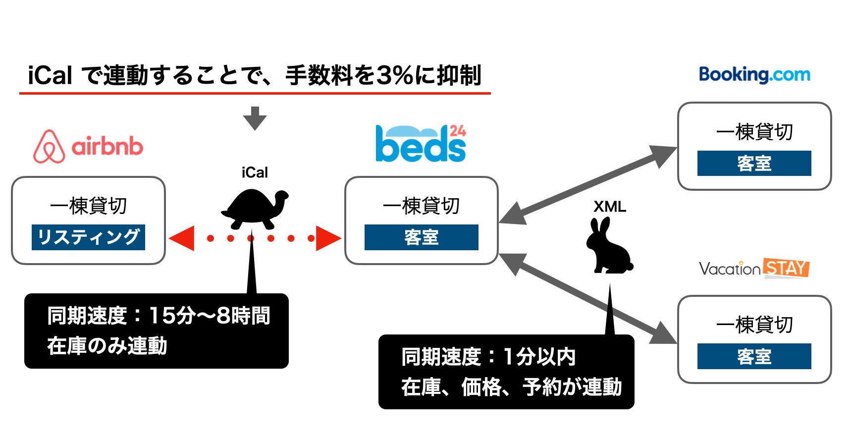ですが、デメリットは承知の上で、どうしてもAirbnbの手数料を3%に抑えつつ、Beds24で複数OTAを管理したい場合は後述の方法で連動することも可能です。