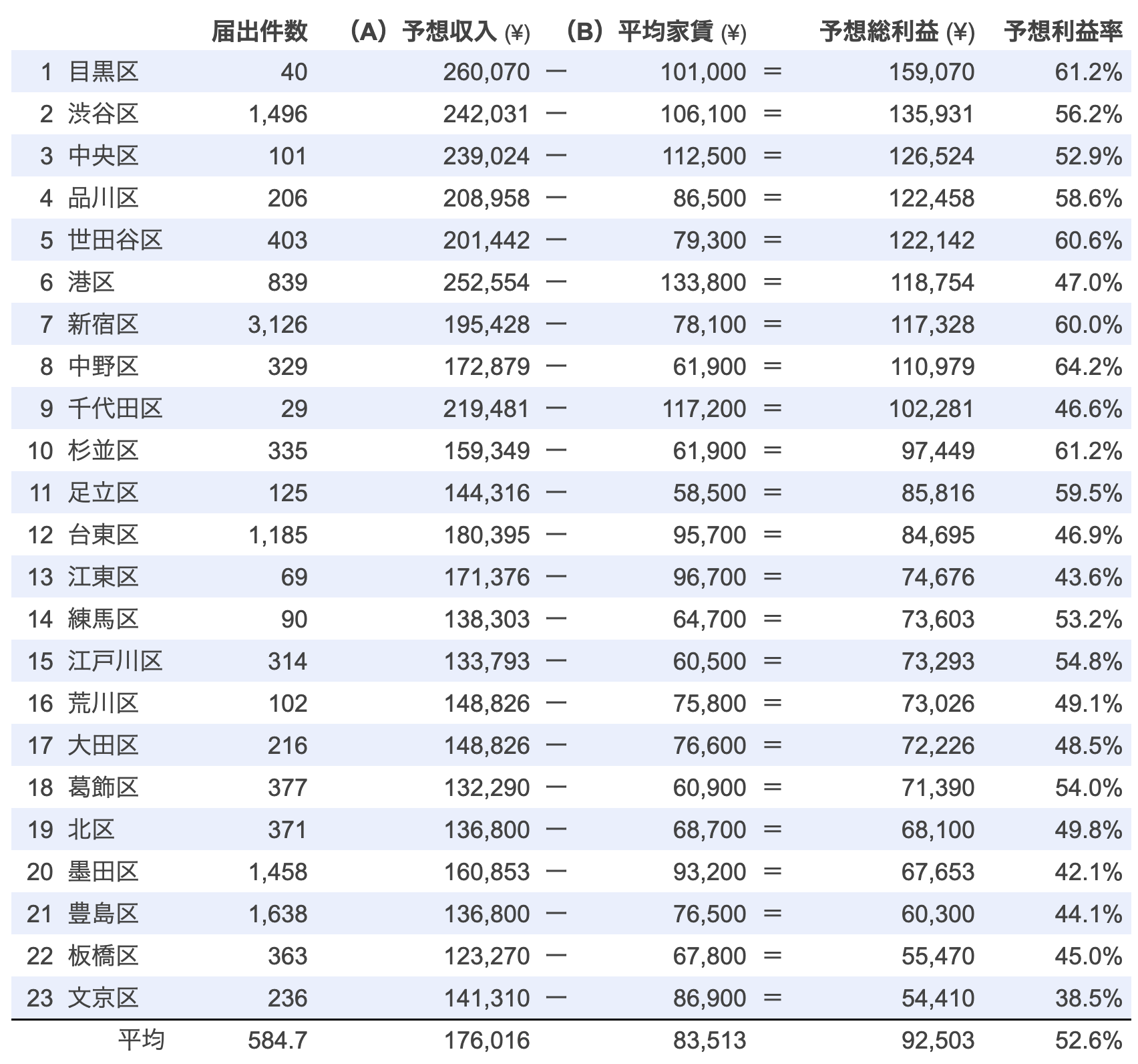 - 家賃が安く、利益率が1, 2位の中野区・杉並区を狙うのもおすすめ