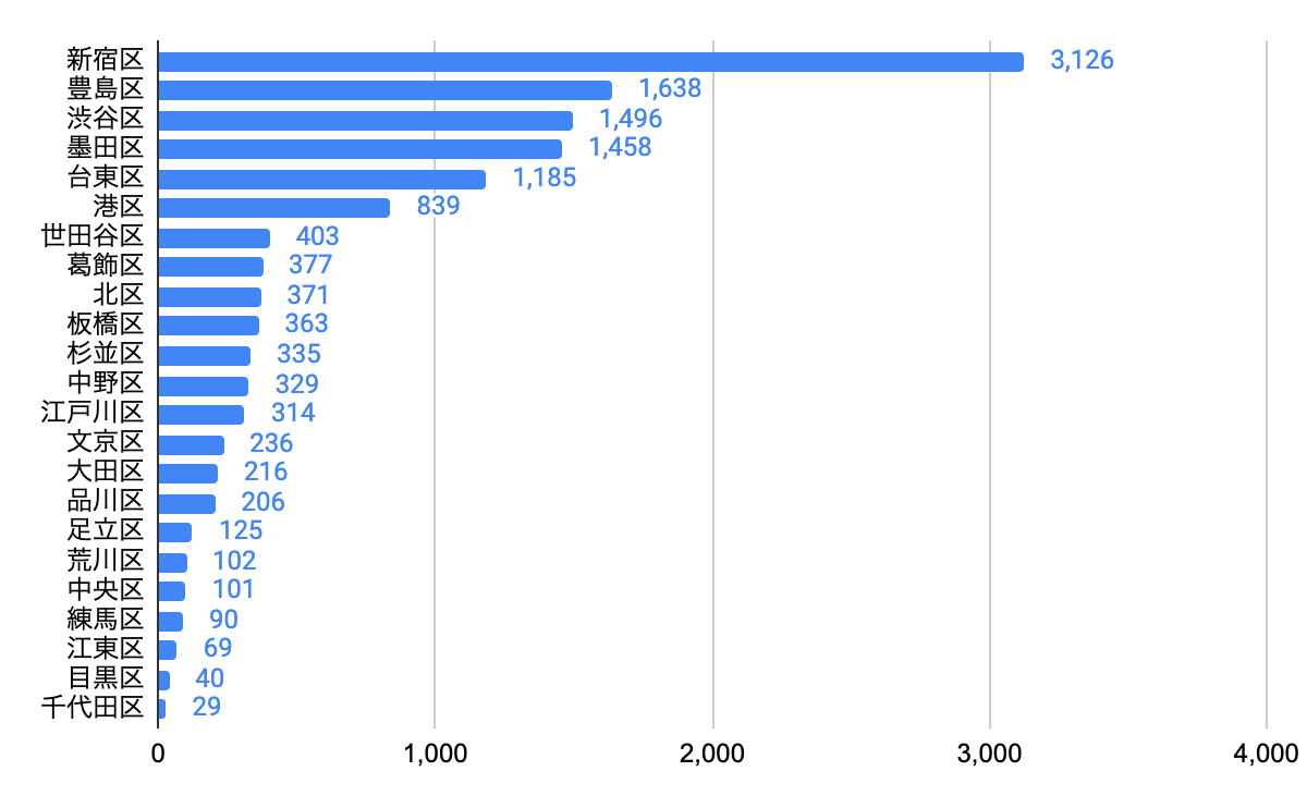 4位・墨田区1,458、5位・台東区1,185と上位5区が1000件を上回り、