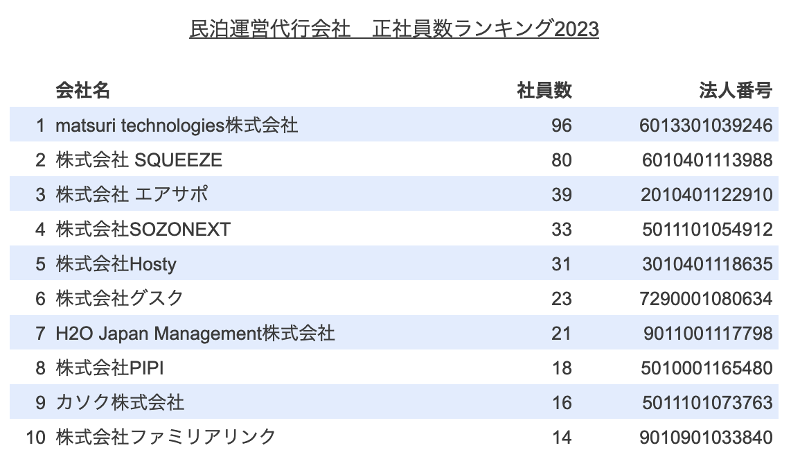 民泊代行会社 社員数ランキング2023