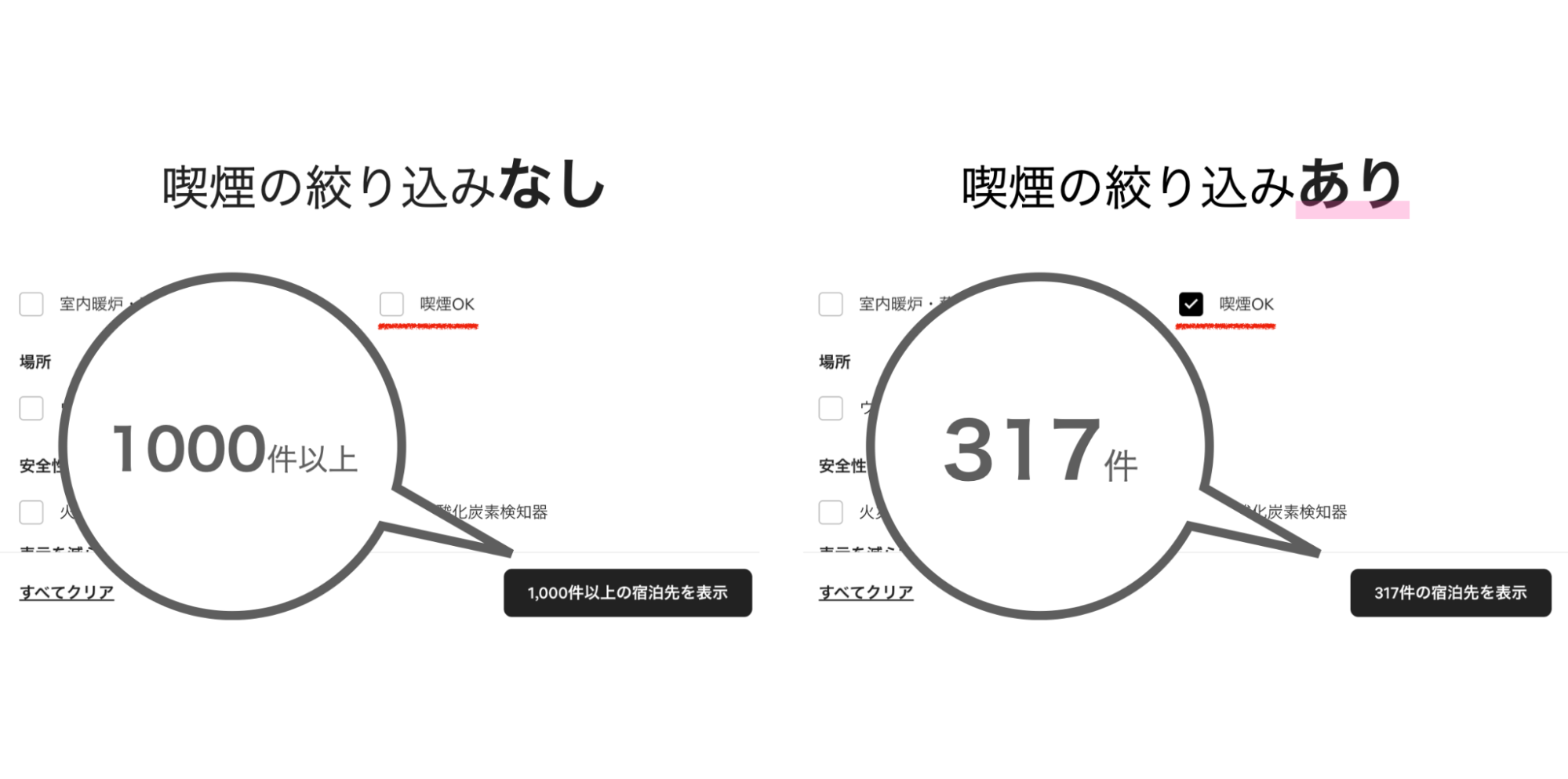 Airbnbで『喫煙OK』で検索した結果、競合は1/3以下になりました。