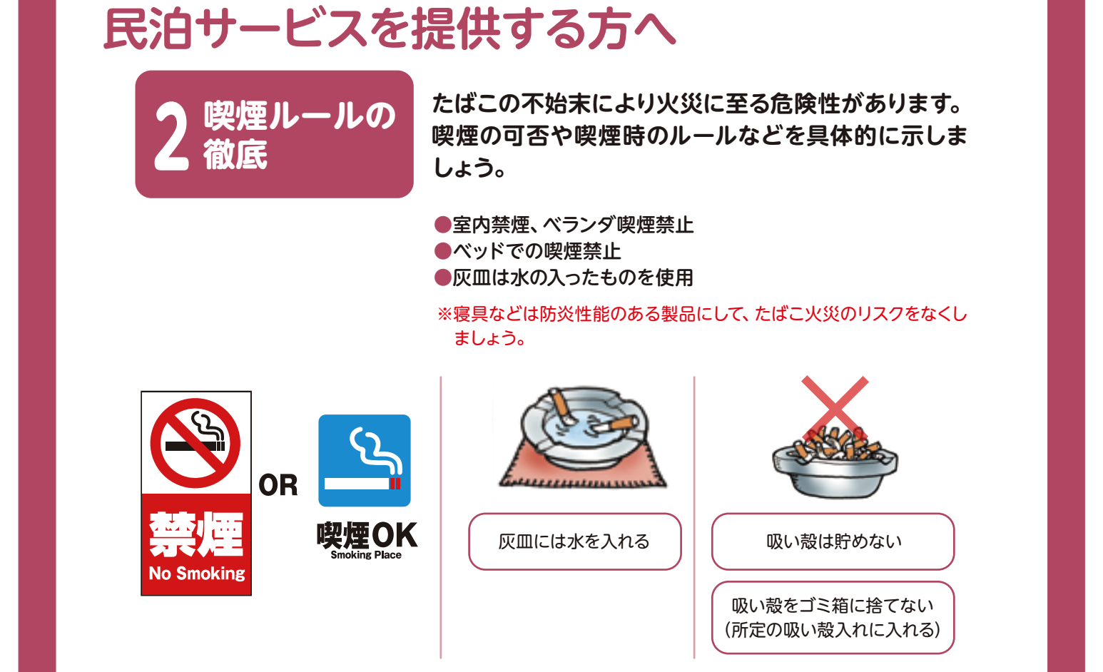 適切なルール提示、火災予防、タバコ臭対策が重要です。