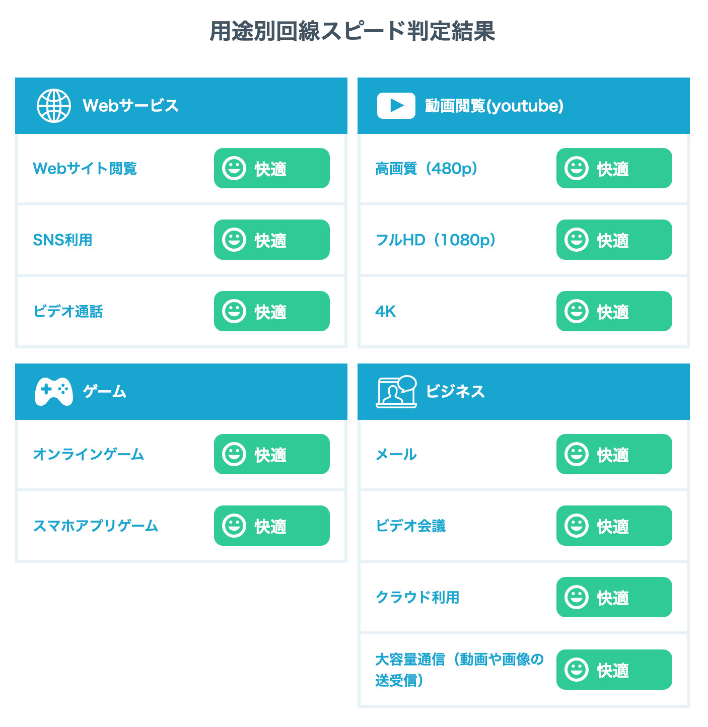 Wi-Fi速度の測定結果を、用途別に快適さをアイコンで示してくれます。