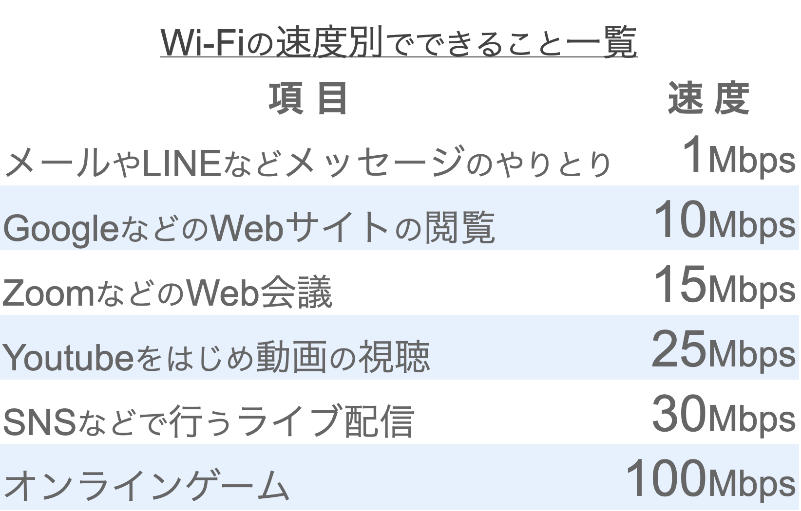 用途によって必要なWi-Fiの速度は異なるので、把握しておくと便利です。